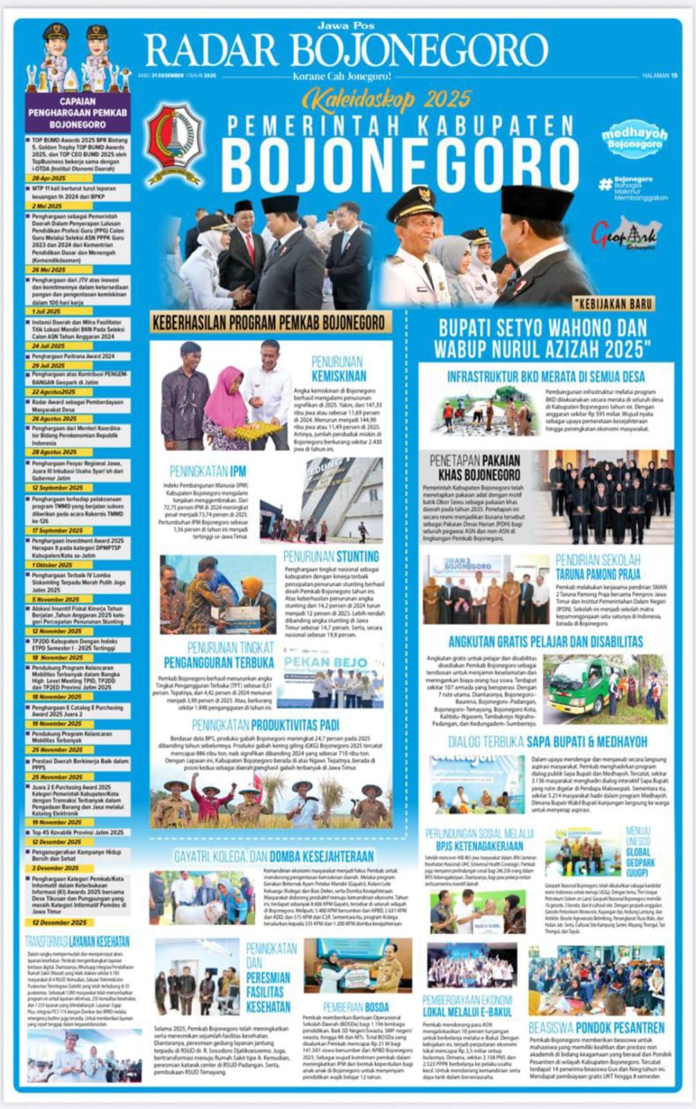 Sepanjang tahun 2025, Kabupaten Bojonegoro mencatat berbagai kemajuan dan terobosan strategis dalam pembangunan daerah. Beragam capaian positif berhasil diwujudkan melalui program yang terarah dan inovatif, mulai dari upaya penurunan angka kemiskinan, angka pengangguran, angka stunting, peningkatan kualitas sumber daya manusia yang tercermin dalam naiknya Indeks Pembangunan Manusia (IPM) & meningkatnya Pendapatan Asli Daerah (PAD), hingga pemerataan pembangunan infrastruktur desa yang semakin memperkuat konektivitas dan produktivitas masyarakat, pendidikan, kesehatan, keterbukaan informasi dan pelayanan publik.