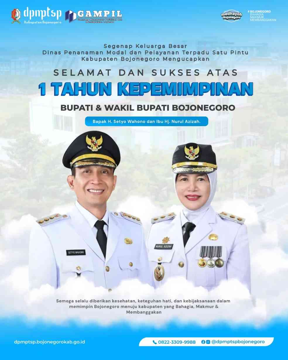Segenap Keluarga Besar DPMPTSP dan Mal Pelayanan Publik Kabupaten Bojonegoro mengucapkan selamat atas 1 tahun kepemimpinan Bapak H. Setyo Wahono dan Ibu Hj. Nurul Azizah.