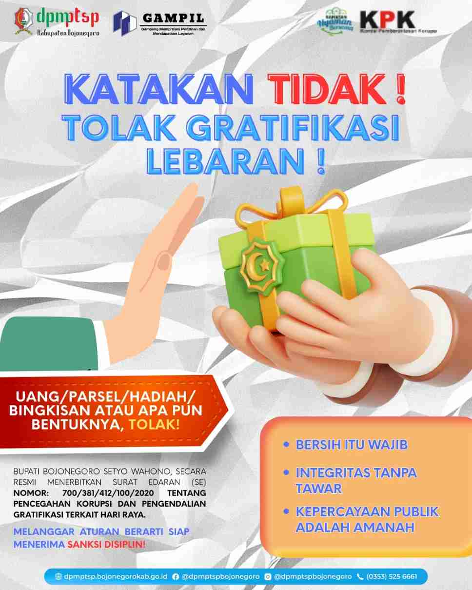 Dalam rangka menjaga integritas dan kepercayaan publik, mari bersama-sama menolak segala bentuk gratifikasi, baik berupa uang, parsel, hadiah, bingkisan maupun dalam bentuk apa pun.